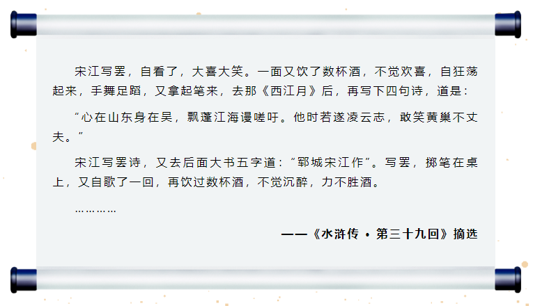 于是,在酒勁兒慫恿之下,宋江提筆揮毫,在潯陽樓上寫了一首詩:“心在山東身在吳,飄蓬江海謾?quán)涤?。他時若遂凌云志,敢笑黃巢不丈夫!”臨了,還不忘署上自己的大名——鄆城宋江。