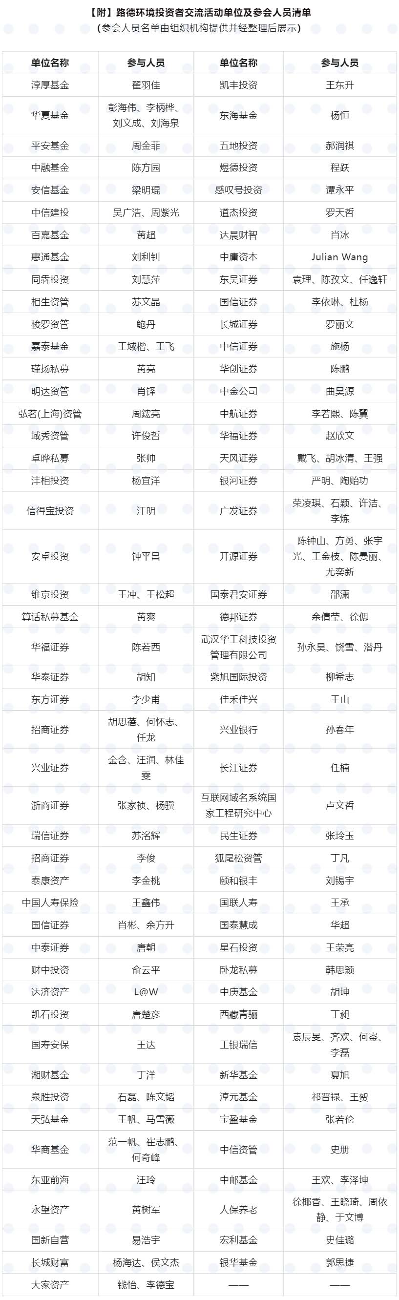 2023年4月28日-5月12日,路德環(huán)境組織了多場線上、線下投資者交流活動(dòng),與中信證券、中信建投證券、銀河證券、浙商證券、東吳證券、中航證券、天風(fēng)證券、建銀理財(cái)、明達(dá)資產(chǎn)、永望資產(chǎn)等90余家機(jī)構(gòu)進(jìn)行了深入溝通。