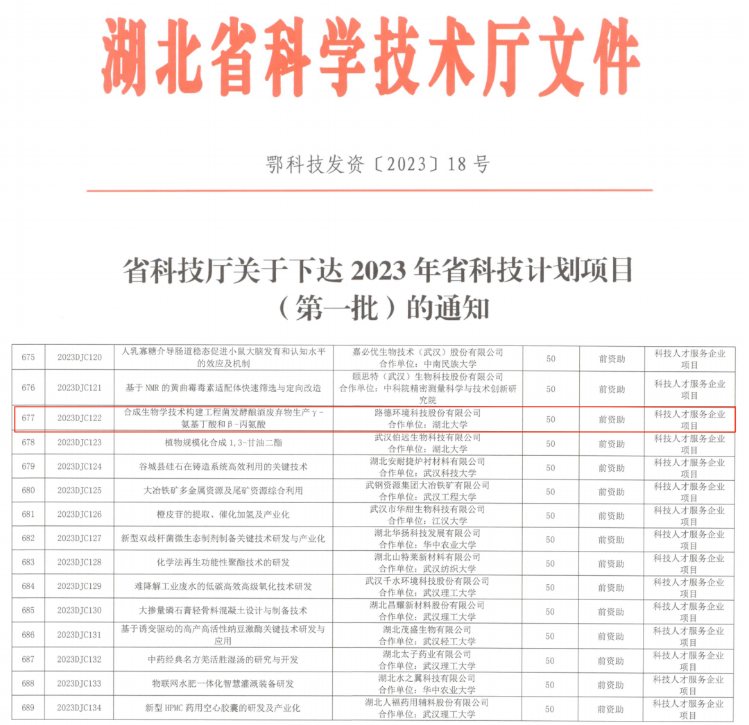 近日,湖北省科技廳公布了2023年省科技計(jì)劃立項(xiàng)項(xiàng)目(第一批)清單,其中,路德環(huán)境“合成生物學(xué)技術(shù)構(gòu)建工程菌發(fā)酵釀酒廢棄物生產(chǎn)γ-氨基丁酸和β-丙氨酸”科研項(xiàng)目,成功入選“科技人才服務(wù)企業(yè)項(xiàng)目”,獲得50萬(wàn)元的科研經(jīng)費(fèi)。
