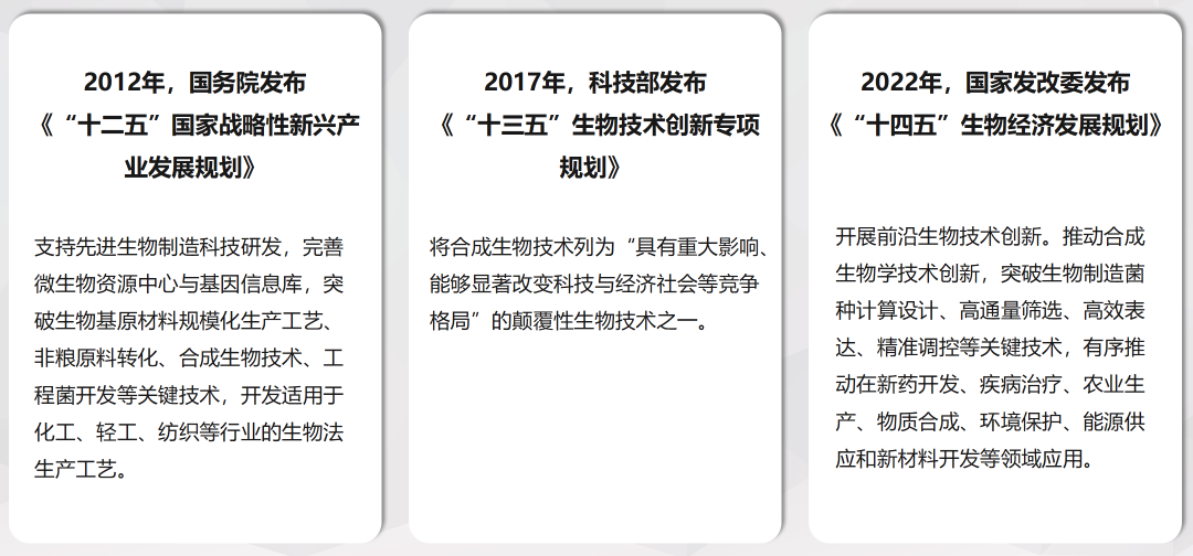 在我國(guó),從“十二五”國(guó)家提出支持先進(jìn)生物制造科技研發(fā),到“十三五”國(guó)家將合成生物技術(shù)列為引領(lǐng)產(chǎn)業(yè)變革的顛覆性技術(shù)之一,再到“十四五”明確表示“要有序推動(dòng)合成生物技術(shù)在新藥開發(fā)、疾病治療、農(nóng)業(yè)生產(chǎn)、物質(zhì)合成、環(huán)境保護(hù)、能源供應(yīng)和新材料開發(fā)等領(lǐng)域應(yīng)用”,一直以來(lái),隨著國(guó)家持續(xù)出臺(tái)政策予以大力支持,我國(guó)合成生物產(chǎn)業(yè)擁有廣闊的發(fā)展前景。