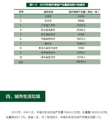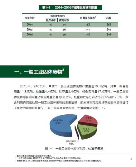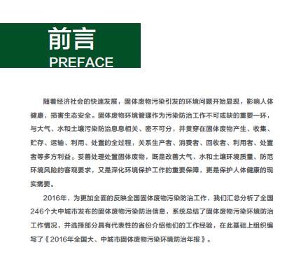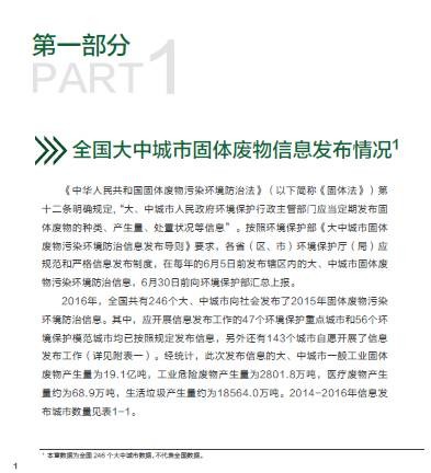 環(huán)保部發(fā)布《2016年全國大、中城市固體廢物污染環(huán)境防治年報年報》,匯總分析了全國246個大中城市發(fā)布的固體廢物污染防治信息,系統(tǒng)總結(jié)了固體廢物污染環(huán)境防治工作情況,并選擇部分具有代表性的省份介紹他們的工作經(jīng)驗。