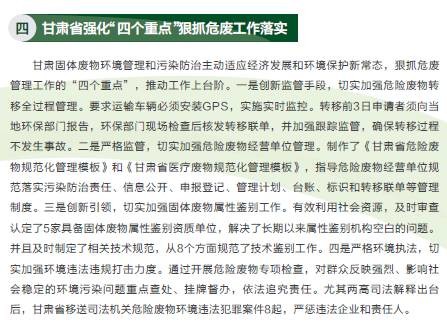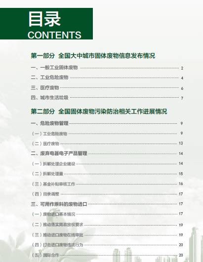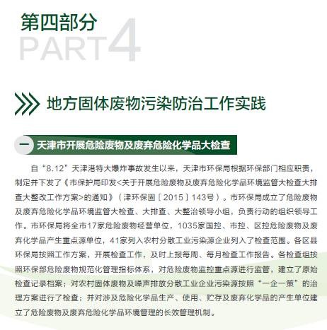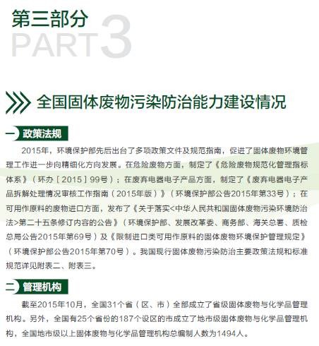 《年報》還介紹了我國現(xiàn)行固體廢物污染防治主要政策法規(guī)、固體廢物管理機構(gòu)能力建設(shè)情況、固體廢物管理技術(shù)培訓(xùn)情況以及固體廢物污染防治相關(guān)科研成果。并選擇4個代表性省份,介紹了他們在解決固體廢物管理重點、難點問題方面的經(jīng)驗和做法。